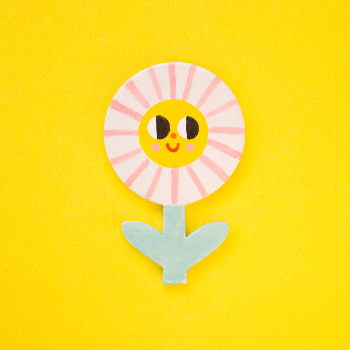 Flowers for hanging, hand built with ceramic earthenware, hand-painted with ceramic crayons/underglazes and a layer of transparent glossy glaze for a shiny finishing.