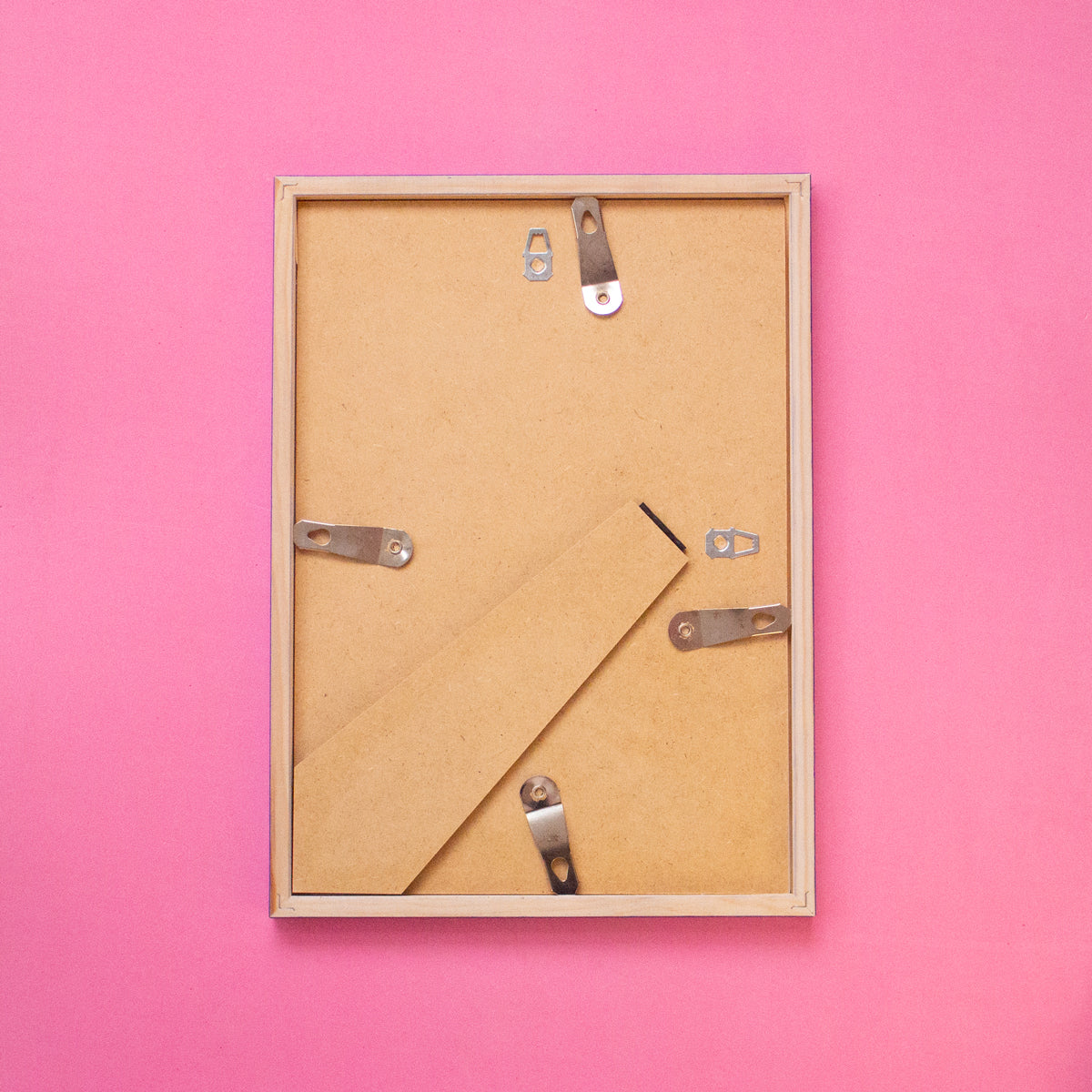 Each frame includes a regular glass front and two metal hangers on the back for both vertical and horizontal display. It also features a sturdy easel stand for flat surfaces. Easy to open from the back using metal clips that turn sideways — no tools needed.