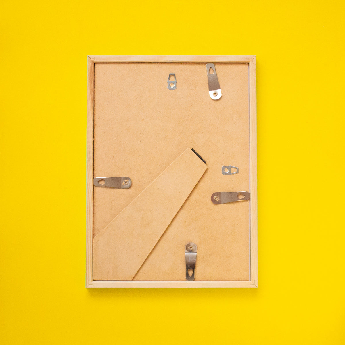 Each frame includes a regular glass front and two metal hangers on the back for both vertical and horizontal display. It also features a sturdy easel stand for flat surfaces. Easy to open from the back using metal clips that turn sideways — no tools needed.