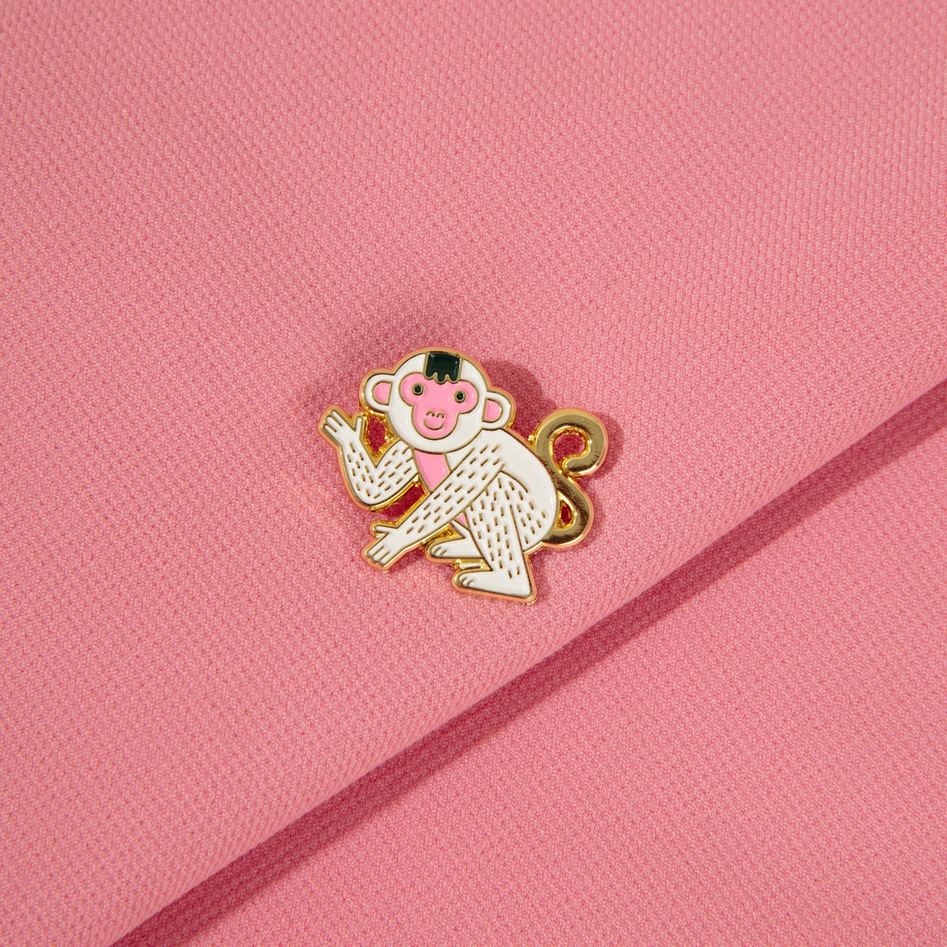 Enamel Pin featuring a monkey in white, black and pink. .High Polish Gold Plating and metal clutch fixing.Dimension: 3x2 cmPacked on a cardboard printed tag.