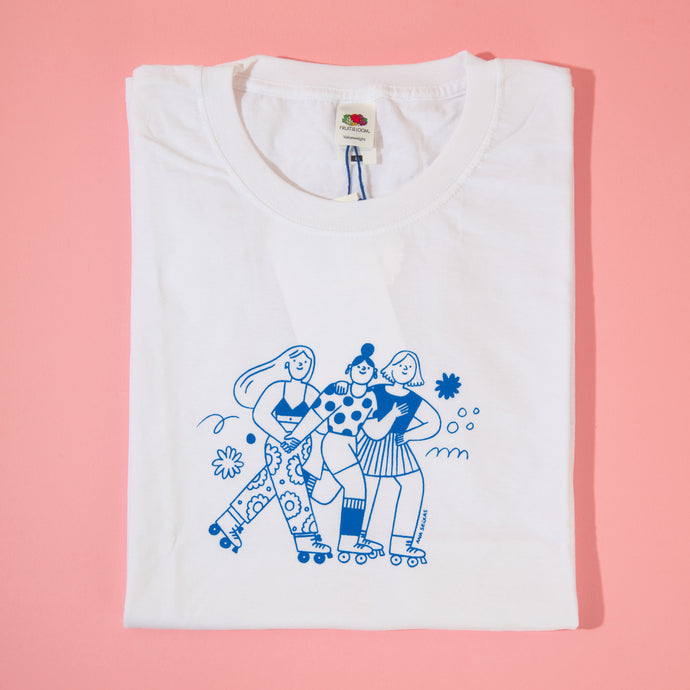 Roller Skater Girls Handprinted T-shirt // White & Blue