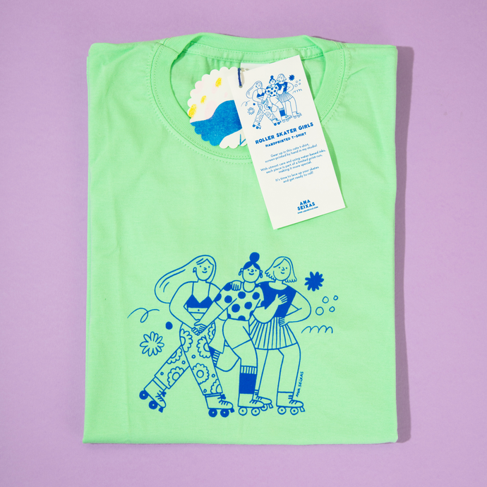 Roller Skater Girls Handprinted T-shirt // Mint Green