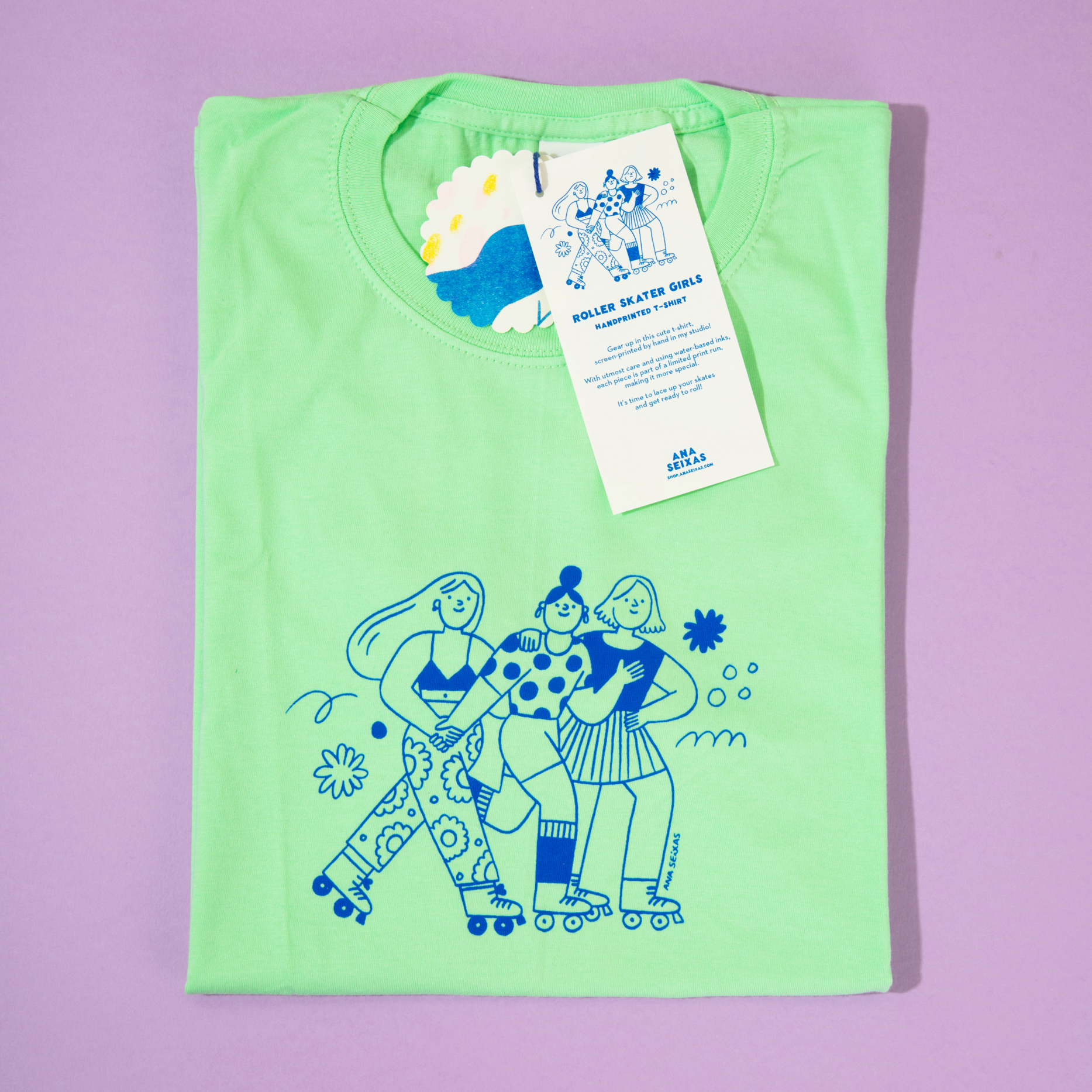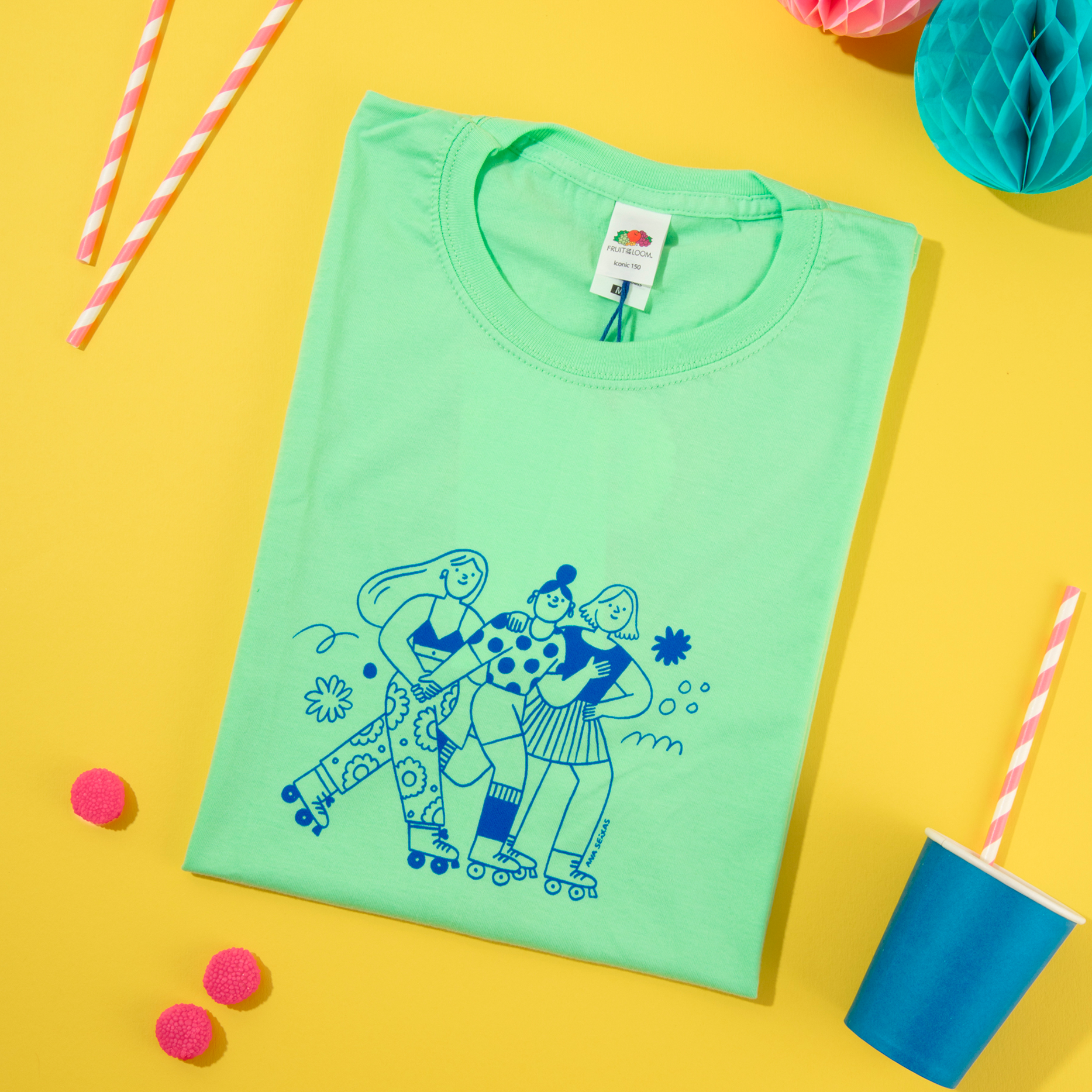 Mint Green T-shirt with an illustration on the front featuring three roller skater girls. Screen-printed in Blue.