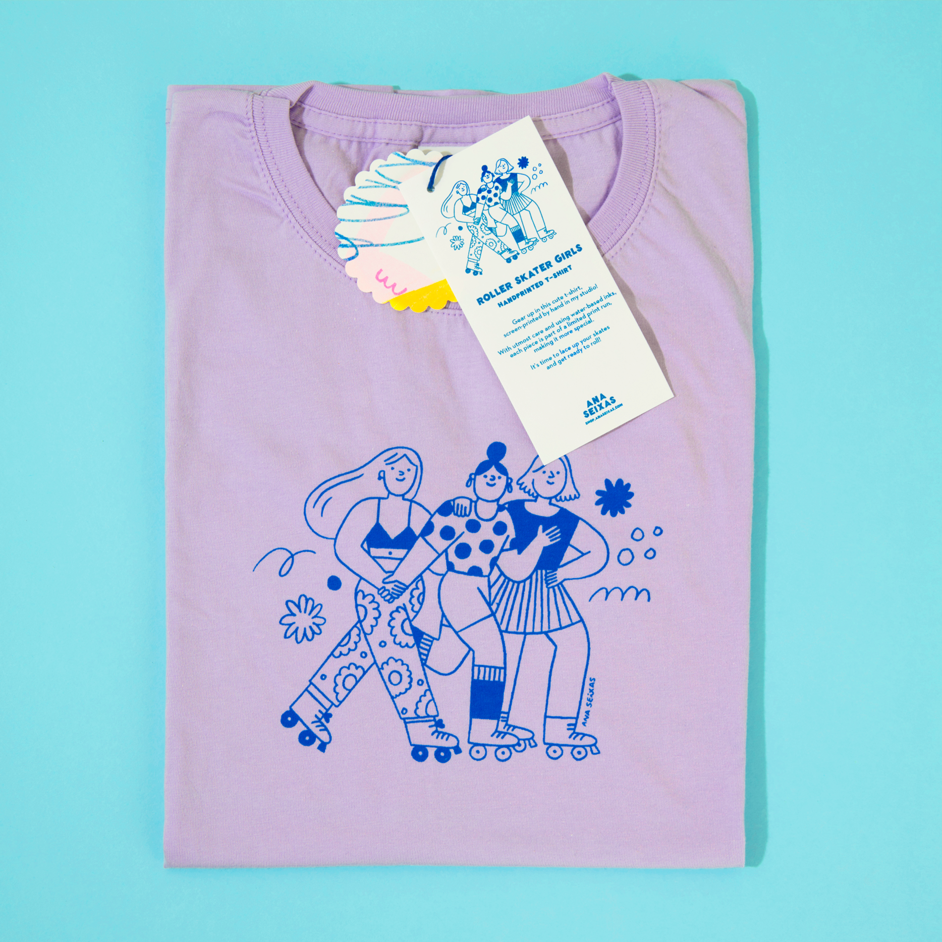 Purple T-shirt with an illustration on the front featuring three roller skater girls.